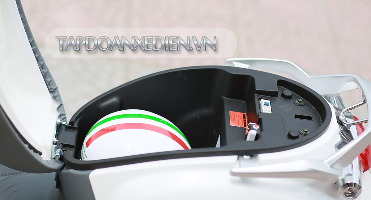 Cốp xe của Aima P sâu, rộng hơn các dòng xe điện khác có thể đựng vừa 1 – 2 chiếc mũ bảo hiểm nửa đầu và có ngăn riêng để đựng các vật dụng cá nhân khác. Đặc biệt xe điện Aima P còn sử dụng hệ thống đèn Led chiếu sáng trong cốp xe tiện lợi cho người dùng trong điều kiện thiếu ánh sáng. Cổng sạc USB được tích hợp trong cốp xe dành cho các thiết bị di động như điện thoại hay máy tính bảng.