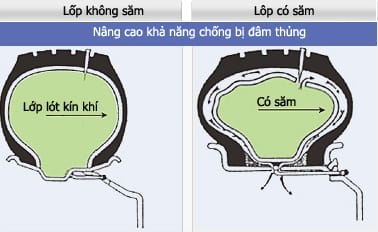 Về cơ bản lốp không săm có thể giữ không khí bên trong mà không cần tới săm xe. Trong trường hợp lốp bị thủng do cán đinh hoặc vật nhọn thì bánh xe không bị mất hơi đột ngột, xe vẫn giữ lại hơi và vẫn có thể chạy một chặng đường dài nữa giúp bạn không phải dắt xe để tìm cửa hàng sửa chữa xe điện.