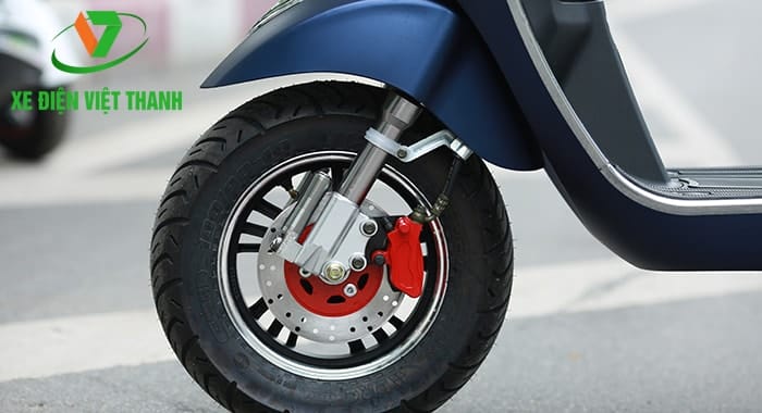 Xe thiết kế bánh xe lớn, với các rãnh sâu, tạo độ bám đường cực tốt. Hệ thống phanh đĩa lớn, khi phanh gấp, ma sát áp má phanh vào bánh xe, xe sẽ giảm gia tốc, nhanh chóng dừng lại một cách an toàn.
