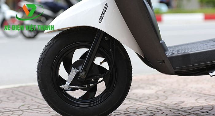 Bánh xe thép đúc không xăm, đường kính phù hợp với độ thiết kế của xe. Đường hoa văn lượn lờ với khoảng cách ngắn tăng độ bám đất, xe chạy mọi địa hình.